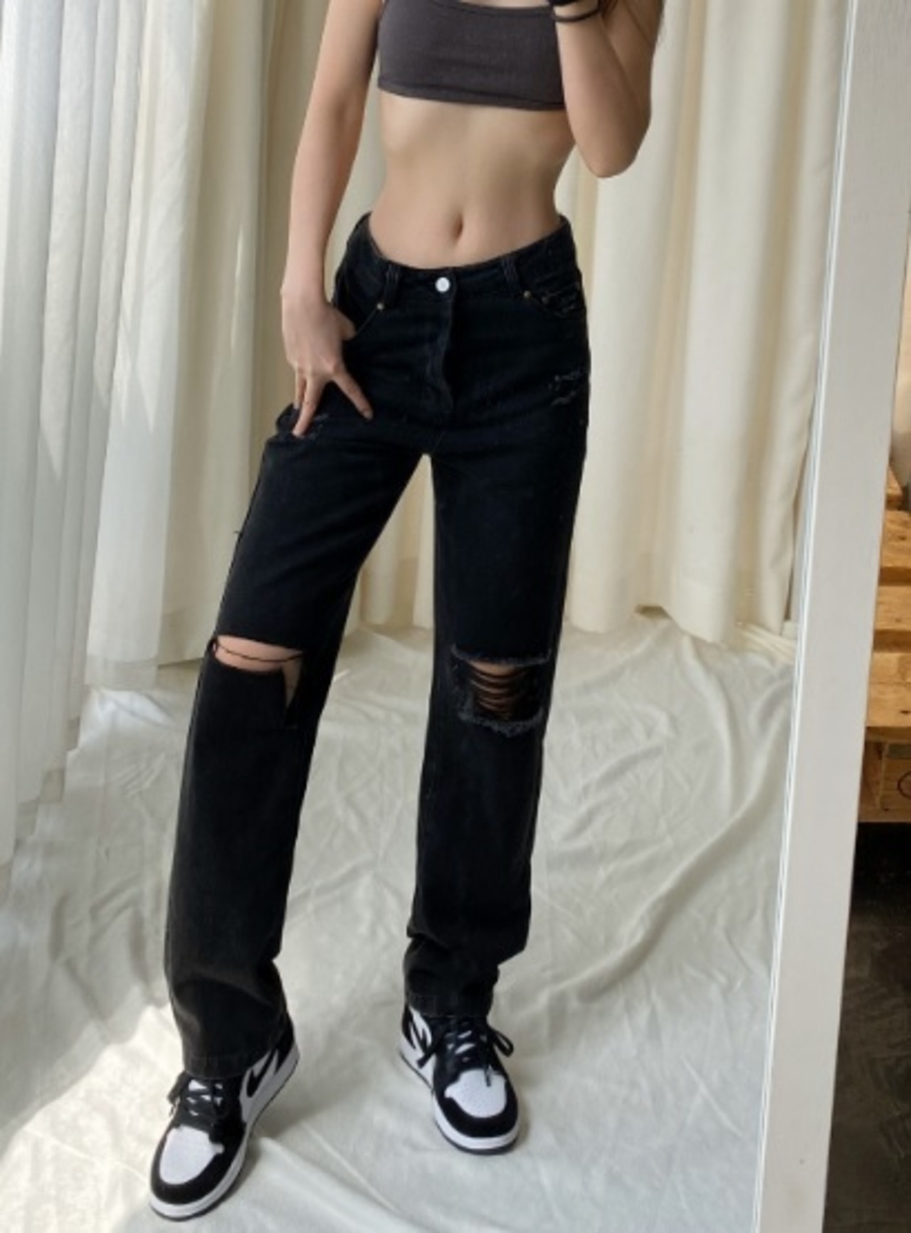 ジーンズ ダメージジーンズ デニムパンツ 美脚 細見え 黒 ロング丈 秋 無地 かっこいい 10代 20代 30代 お出かけ デート 着まわし 大人女子 クール カジュアル シンプル トレンド