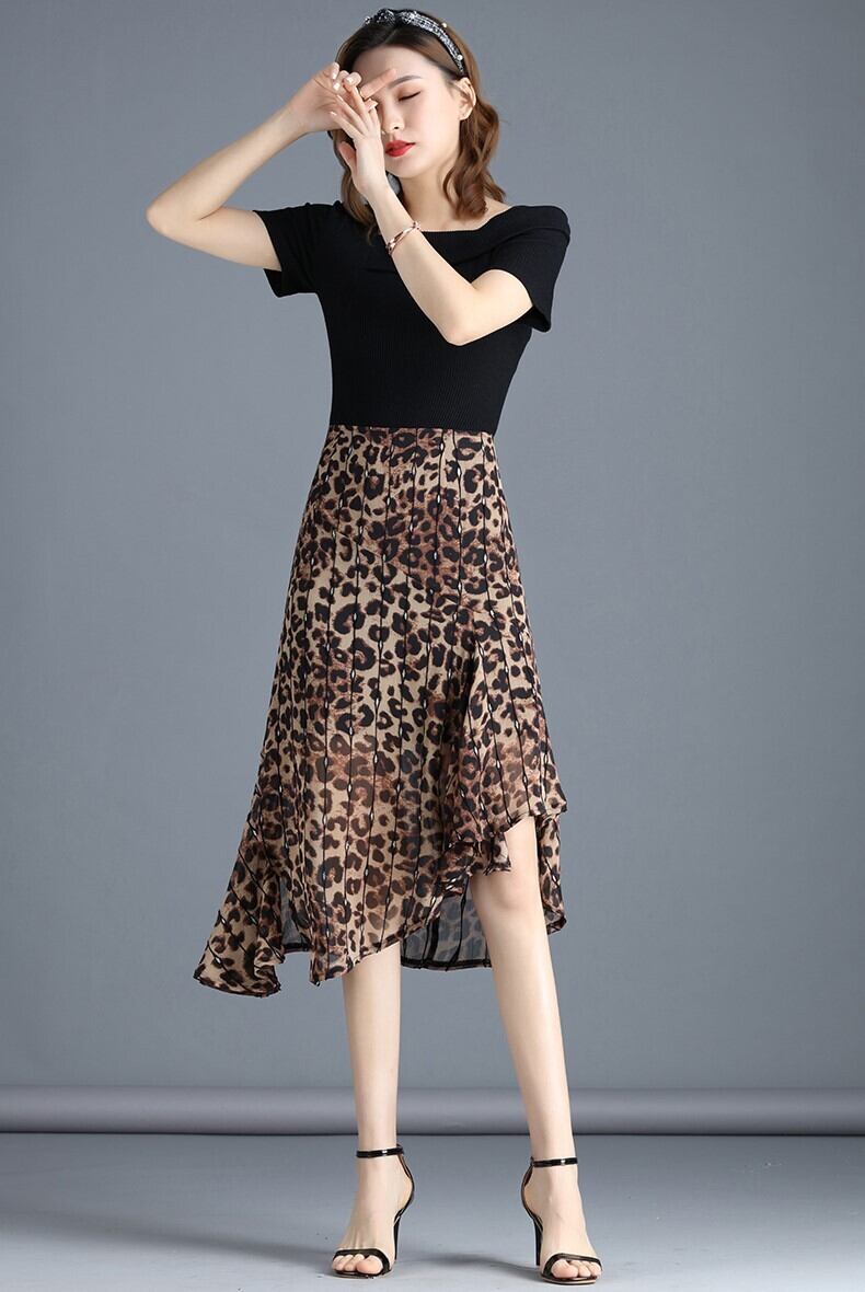 ヒョウ柄スカート フレア ドレープ 不規則 アシンメトリー スリット 裏地付き 大きめサイズ ミディアム丈 ロング シフォン オシャレ 大人 アニマル 個性的 ハイウエスト ウエストファスナー バックファスナー 春 夏 秋 ボトムス 女性 レディース