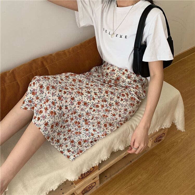 ●レトロな小花がいっぱいのミディアム丈スカートです。スリット入りで動きやすさアップ!シンプルで女性らしいデザインです。