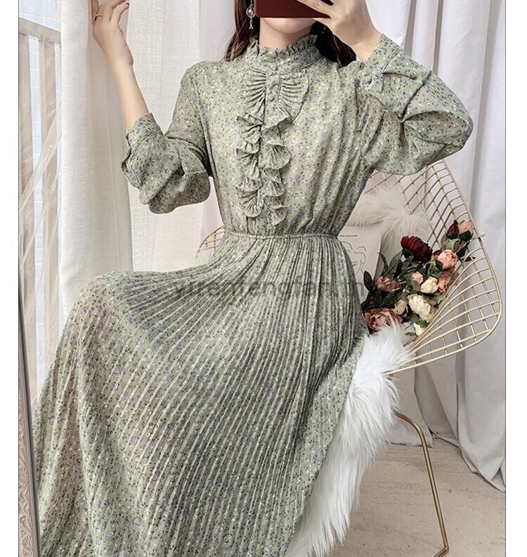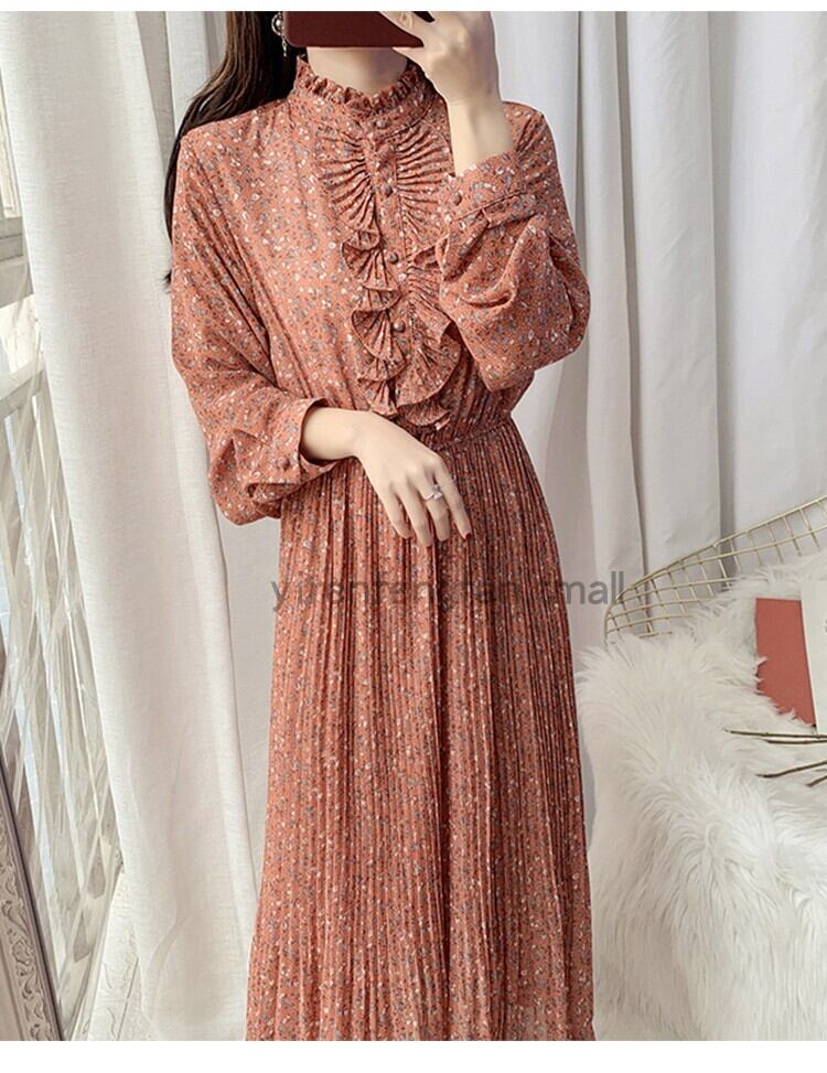 シフォンワンピース ドールワンピース プリーツ フリル 小花柄 ボトルネック ロング フレア 長袖 フロントボタン 薄手 透け感 甘カワ ドレスワンピース 春 秋 女性 レディース