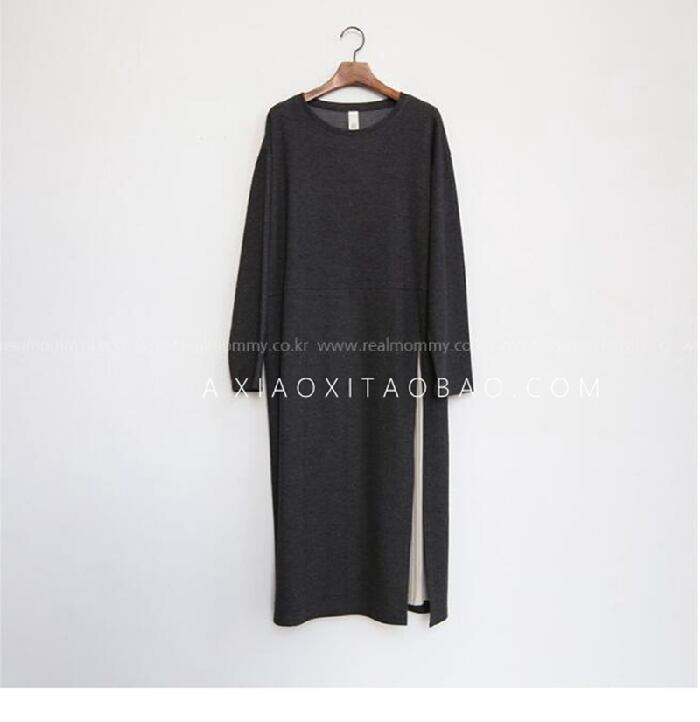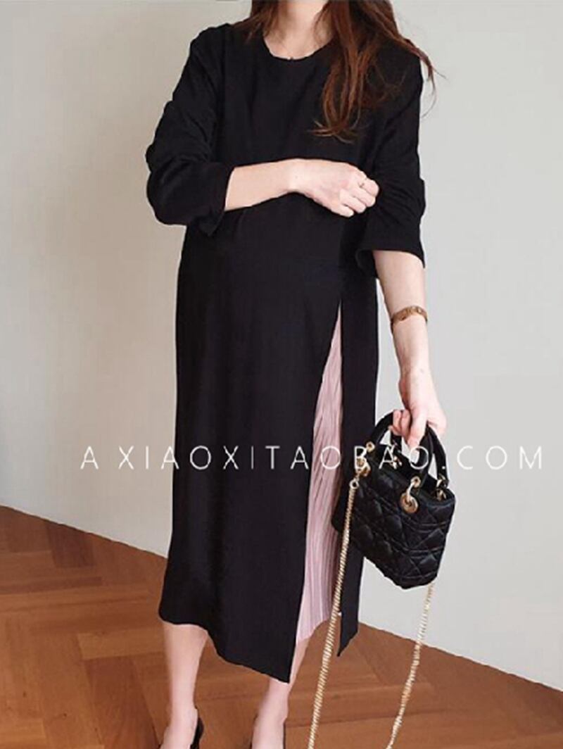 ミディアム丈ワンピース プリーツ スリット ロング 重ね着風 無地 ラウンドネック 長袖 プルオーバー ゆったり 体型カバー マタニティー着 オシャレ 大人可愛い 秋 冬 女性 レディース