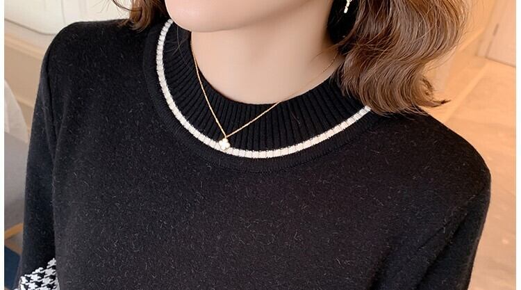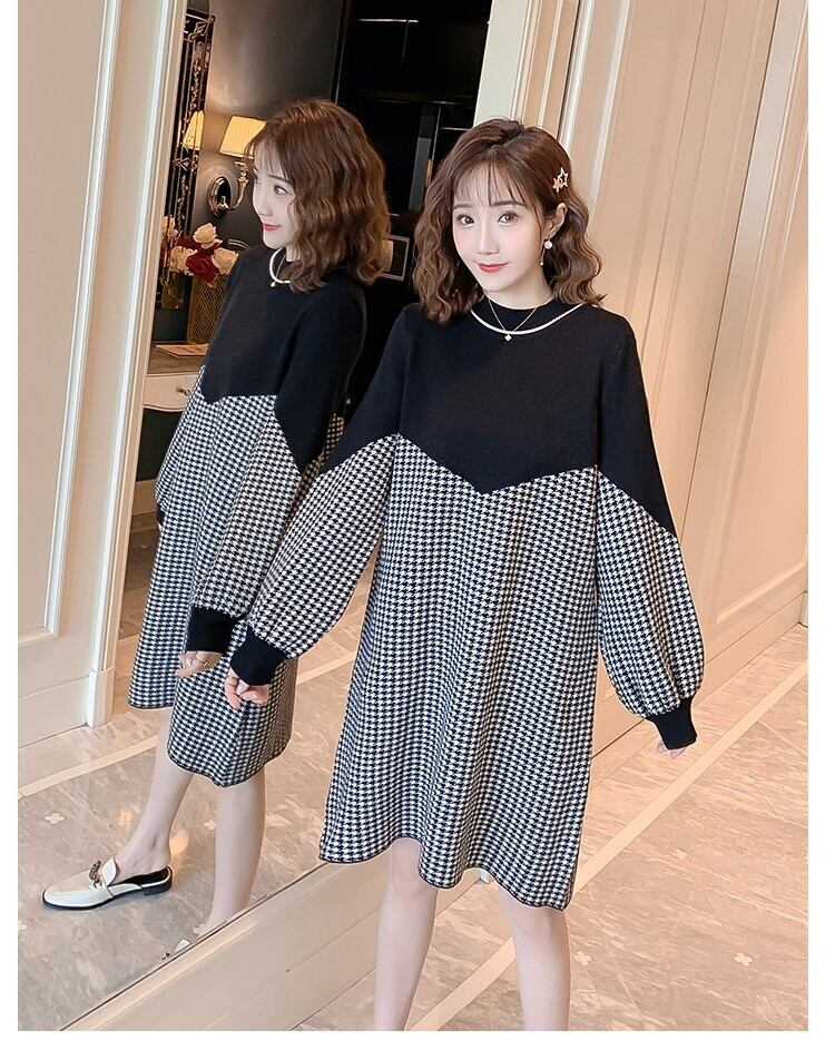 膝丈ワンピース ニット ゆったり 長袖 千鳥柄 ラウンドネック レトロ 体型カバー マタニティー オシャレ 大人可愛い プルオーバー ランタン袖 ボリューム袖 シンプル 秋 冬 大きめサイズ 女性 レディース