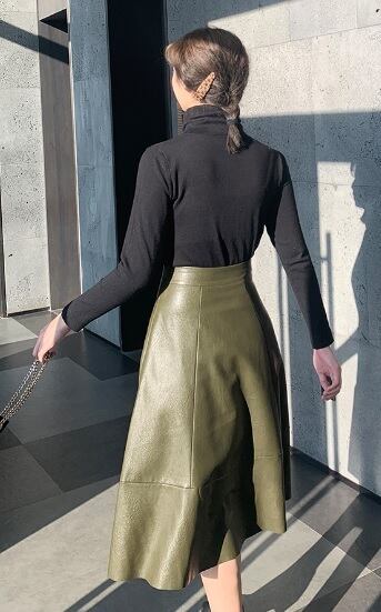 ハイウェストスカート フレアスカート PU レザー ひざ下丈 ミモレ丈 無地 グリーン ブラウン 秋冬 仕事 可愛い シンプル 人気 Aライン 10代 20代 30代 お出かけ デート 上品 きれいめ 清楚 大人女子 OL オフィス トレンド