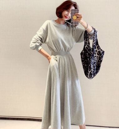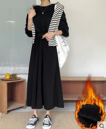 フレアワンピース 暖かい 細見え 綿 裏起毛 秋冬 普段使い ルーム お出かけ デート 黒 ブルー ピンク アプリコット グレー ラウンドネック 大きめ 無地 大人 カジュアル 清楚 可愛い 上品 シンプル ゆったり Aライン 長袖 ミモレ丈 人気 トレンド 10代 20代 30代