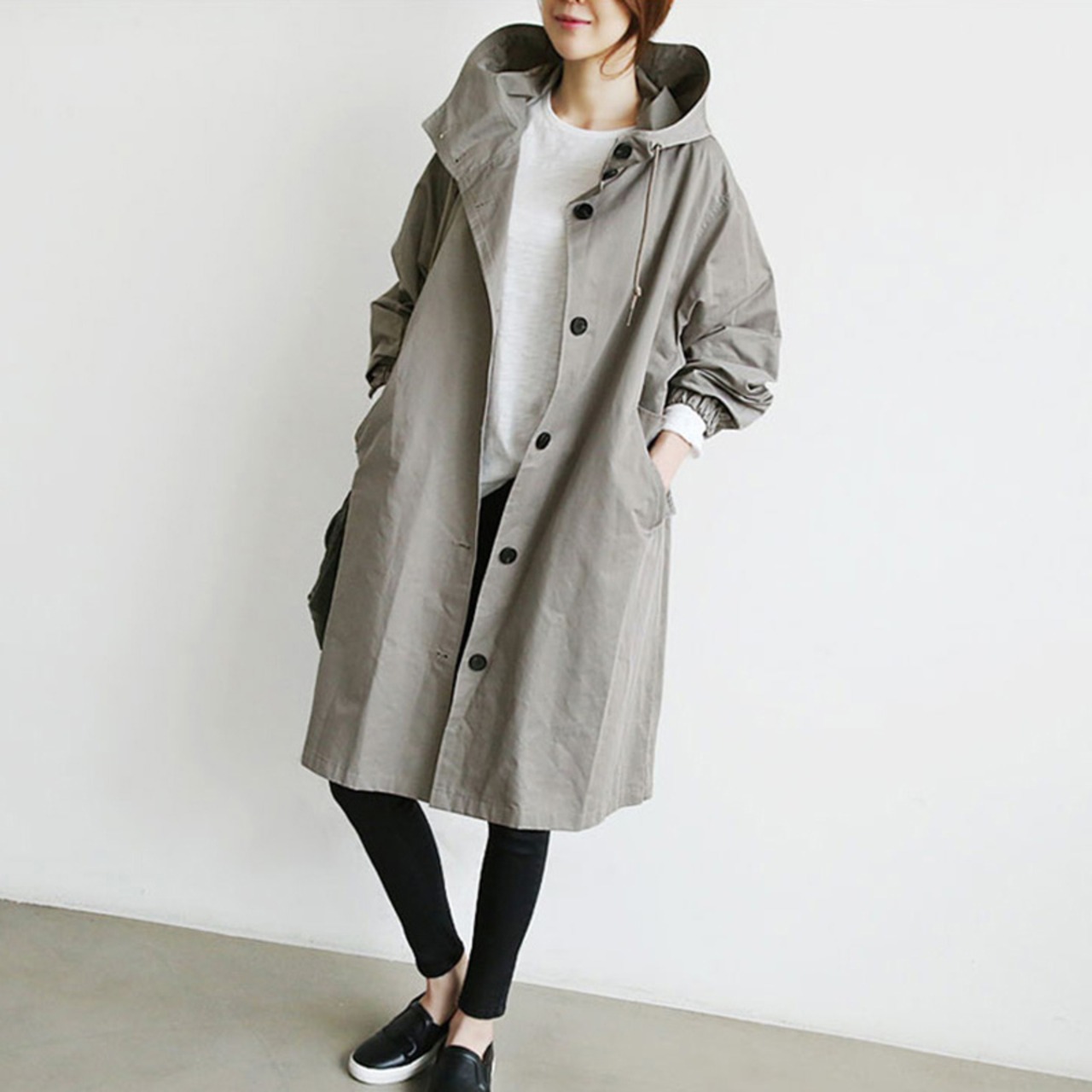 トレンチコート ロングジャケット フード 無地 シンプル カジュアル ミリタリー シック オシャレ フロントボタン ポケット付 袖ゴム サイズ豊富 ゆったり オーバーサイズ アウター 春 秋 女性 レディース