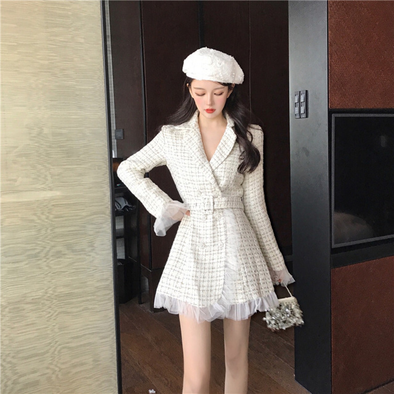 ワンピースジャケット コート ツイード チェック柄 レース ウエストベルト フロントボタン 花柄ボタン スリム 肩パッド 美ライン 大人可愛い び春 秋 アウター 長袖 女性 レディース