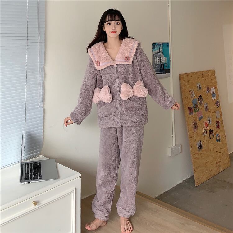 フワモコ ルームウェア セットアップ パジャマ ナイトウェア セーラー襟 ポケット デカリボン フロントボタン ゆったり ボリューミー 暖か 長袖 秋 冬 無地 甘カワ メルヘン パープル 女性 レディース