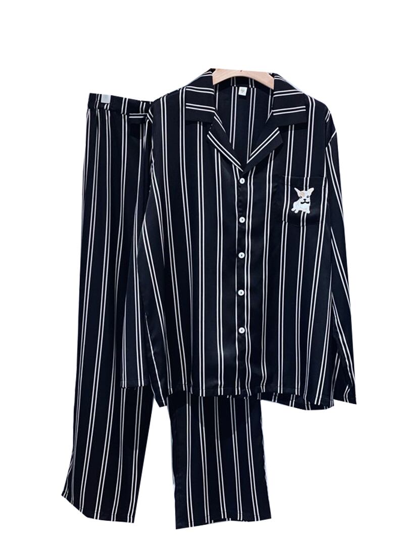 パジャマ ルームウェア ナイトウェア ストライプ クール スタイリッシュ サテン 光沢 フロントボタン 前開き 長袖 ウエストゴム 胸ポケット アニマルプリント ドッグ 犬 春 秋 リラックス 女性 レディース