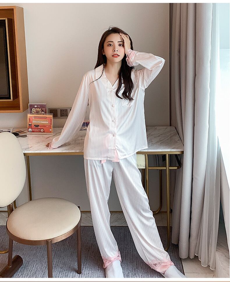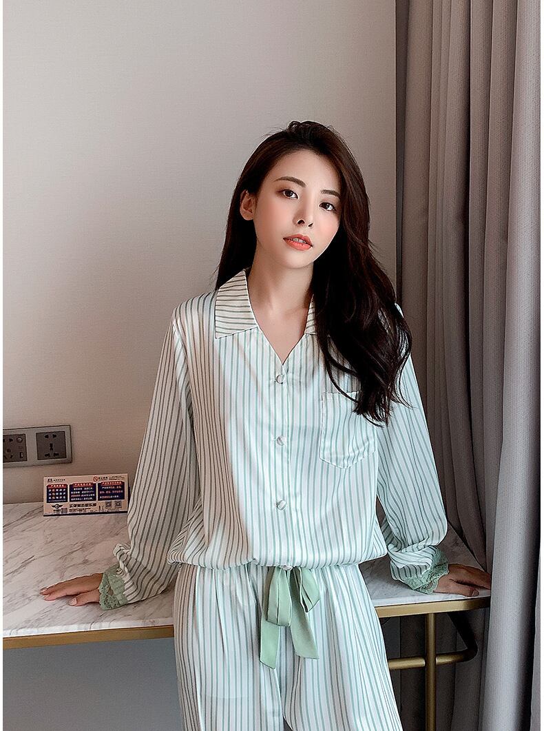 ルームウェア ナイトウェア パジャマ ストライプ レース シンプル 爽やか オシャレ サテン 光沢 セレブ フロントボタン 前開き 長袖 ウエストリボン 胸ポケット 春 初夏 女性 レディース