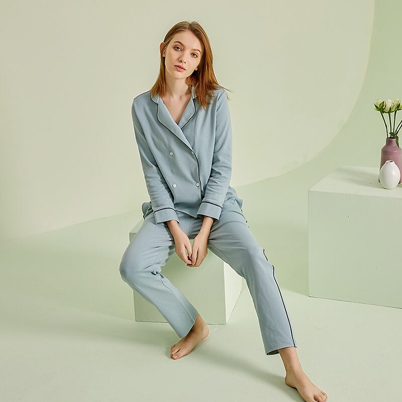 パジャマ ルームウェア ナイトウェア シンプル スウェット クール フロントボタン 前開き ダブルボタン 無地 長袖 パイピング加工 ウエストゴム サイドポケット コットン スーツ襟 スタイリッシュ ショート丈 春 秋 リラックス 女性 レディース