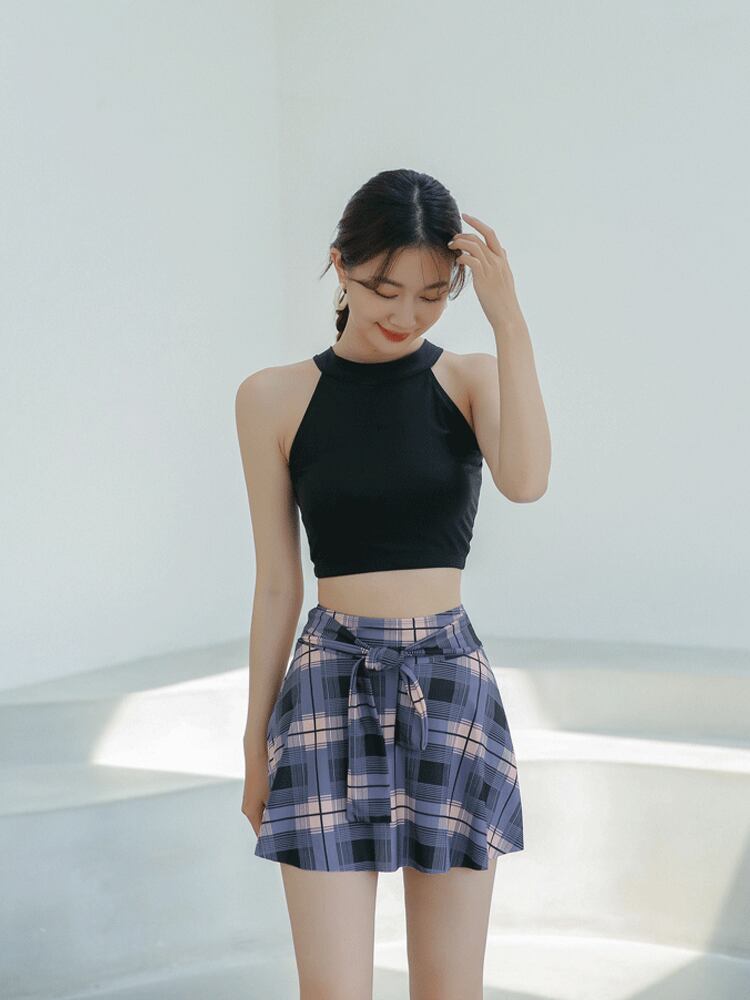 セパレート 水着 セットアップ ホルターネック スカート リボン チェック柄 ボーイレッグ スポーティー カジュアル 体型カバー お尻カバー 太ももカバー ウエストカバー 夏 海水浴 プール ビーチ 女性 レディース