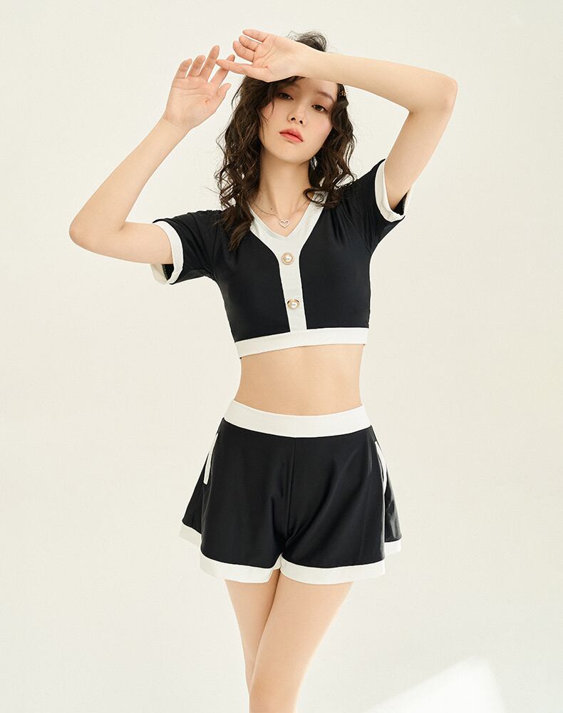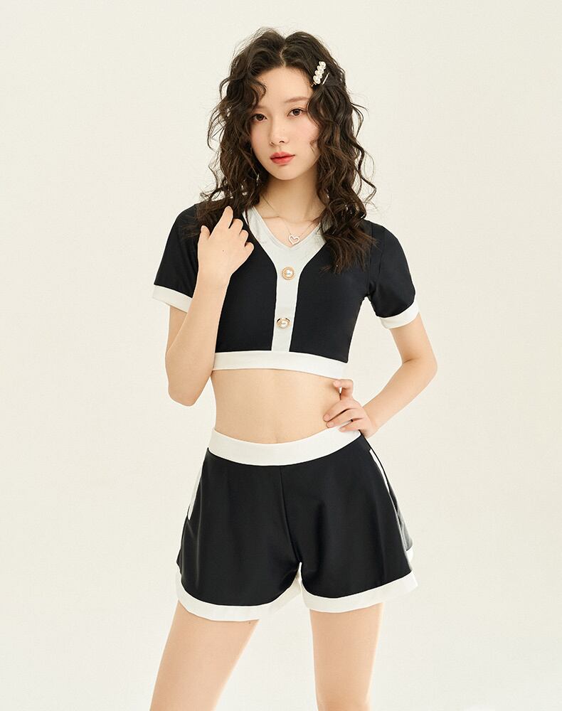 水着 セパレート セットアップ 2ピース 半袖 ショートパンツ プルオーバー 体型カバー お尻カバー 二の腕カバー ウエストカバー パールボタン スポーティー レトロ 無地 クール シンプル ポケット付き 夏 プール 海 女性 レディース