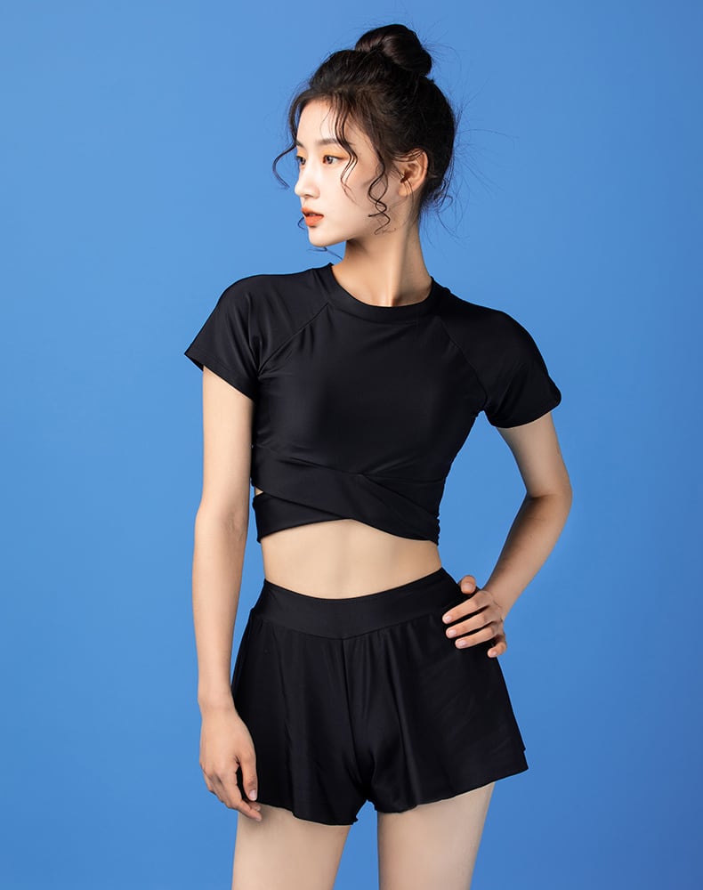 ●半袖とショートパンツのセパレート水着です。動きやすくスポーティーな印象。ウエストのクロスデザインがオシャレでセクシーです。