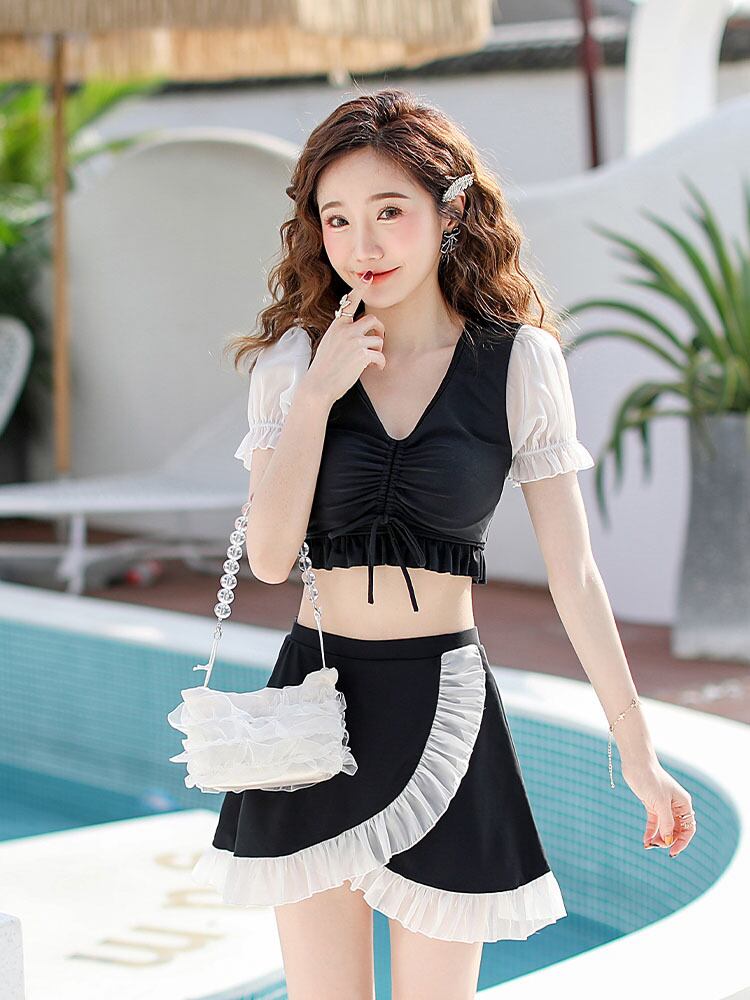 半袖 パフスリーブ セパレート 水着 レース フリル Vネック ラップスカート ボーイレッグ 甘カワ お尻カバー 太ももカバー 二の腕カバー ブラック 黒 プール デート 海 夏 10代 女性 レディース