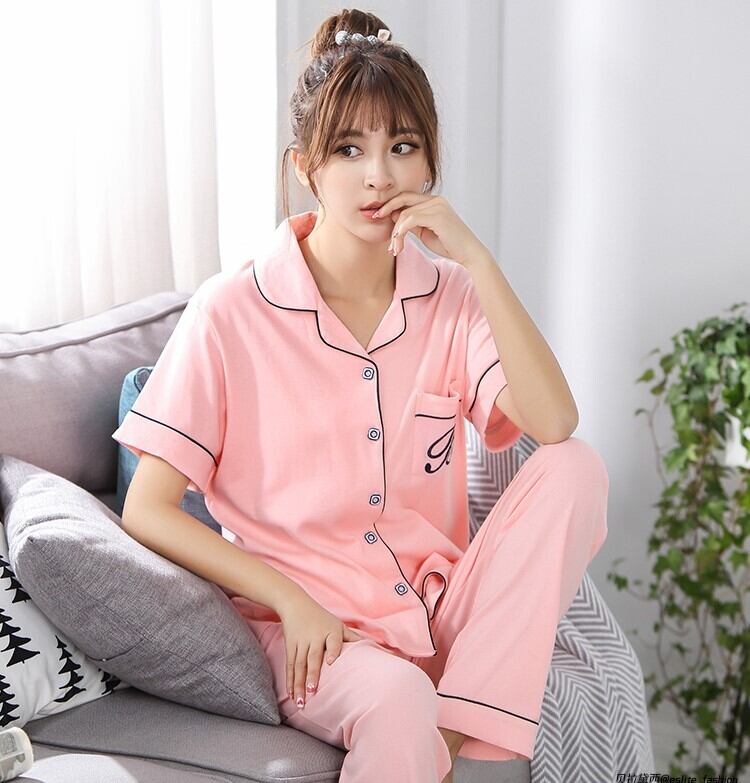 パジャマ ナイトウエア ルームウエア 半袖 フロントボタン 前開き スーツ襟 パイピング加工 胸ポケット ズボンポケット ウエストゴム バック文字 デザインボタン 無地 シンプル 夏 女性 レディース