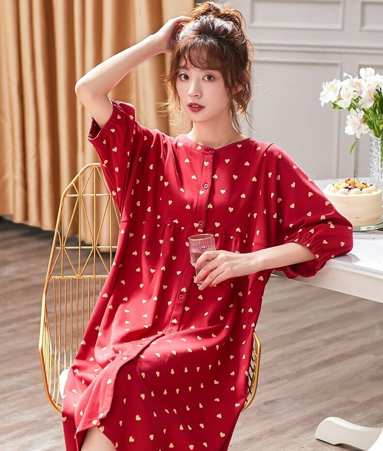 ワンピース ルームウエア パジャマ ナイトウエア レッド ハート柄 綿 コットン 甘カワ ふんわり 七分袖 ラウンドネック フロントボタン 前開き ボリューム袖 ゆったり リラックス ポケット 春 秋 女性 レディース