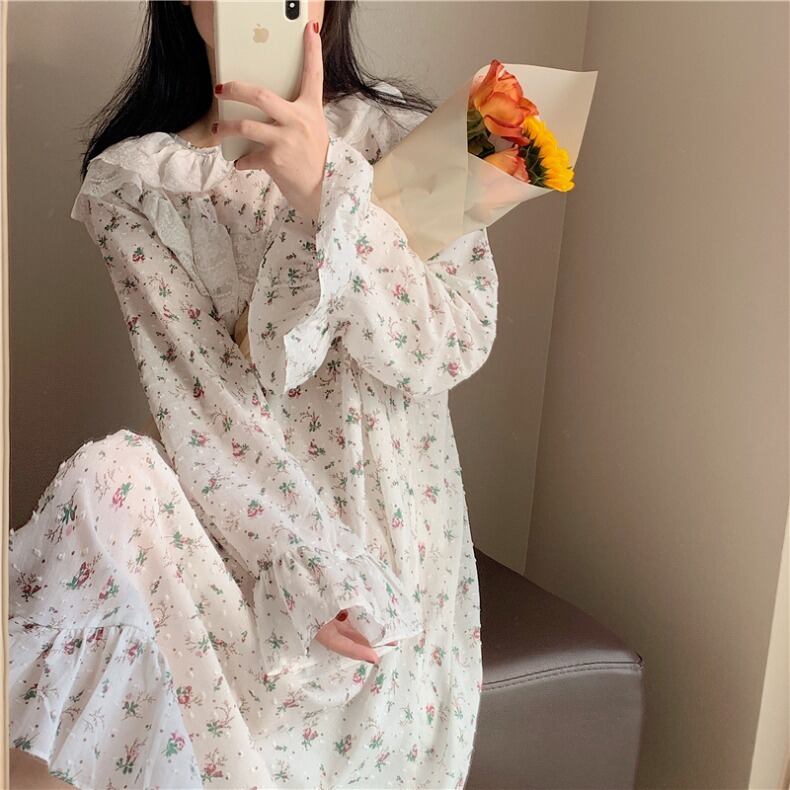ワンピースルームウエア パジャマ ナイトウエア ネグリジェ フリル レース 小花柄 甘カワ レトロ 長袖 プルオーバー プリンセス ゆったり ふんわり 春 秋 女性 レディース