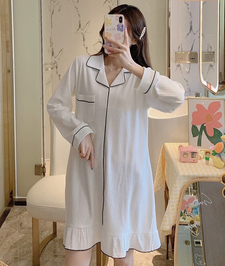 ワンピース ルームウエア パジャマ ナイトウエア ネグリジェ プルオーバー スーツ襟 パイピング加工 膝上 長袖 胸ポケット 無地 シンプル フリル ゆったり 10代 20代 春 秋 女性 レディース