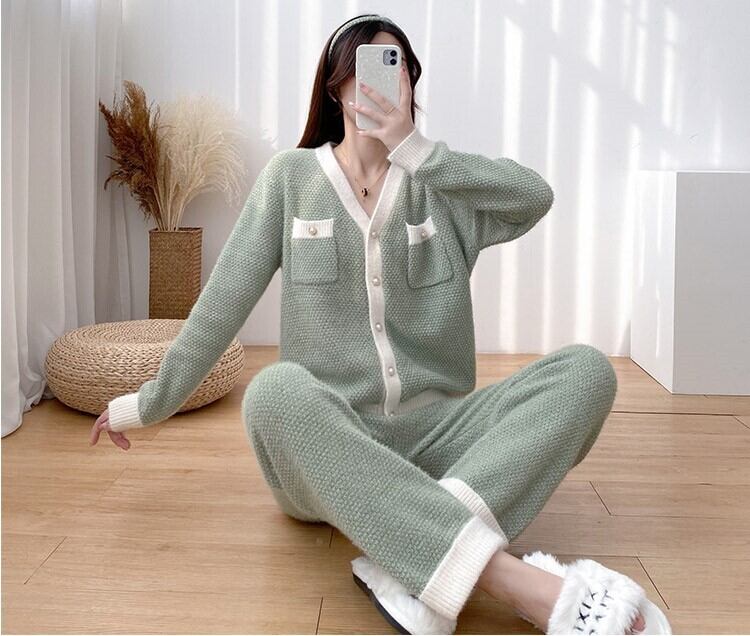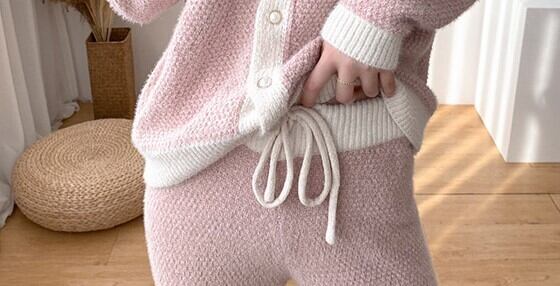 ●暖かなセーター調の生地でできているルームウエアです。パールボタンがエレガントで上品さをプラス!パンツ裾はロールアップになっており、細部にまでこだわりのあるデザインとなっています。