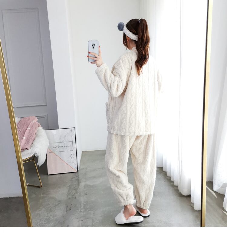 ルームウェア ナイトウェア パジャマ フリース モコモコ ポケット付 前開き フロントボタン 暖か 厚手 ウエストゴム Vネック ゆったり オーバーサイズ 大きめサイズ 秋 冬 女性 レディース