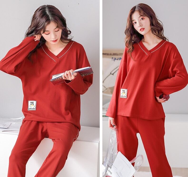 パジャマ ナイトウエア ルームウエア シンプル スポーティー 無地 ピンク レッド ブルー Vネック プルオーバー 長袖 ストレッチ 伸縮性 ウエストゴム ポケット 文字刺繍 ワッペン 春 秋 女性 レディース