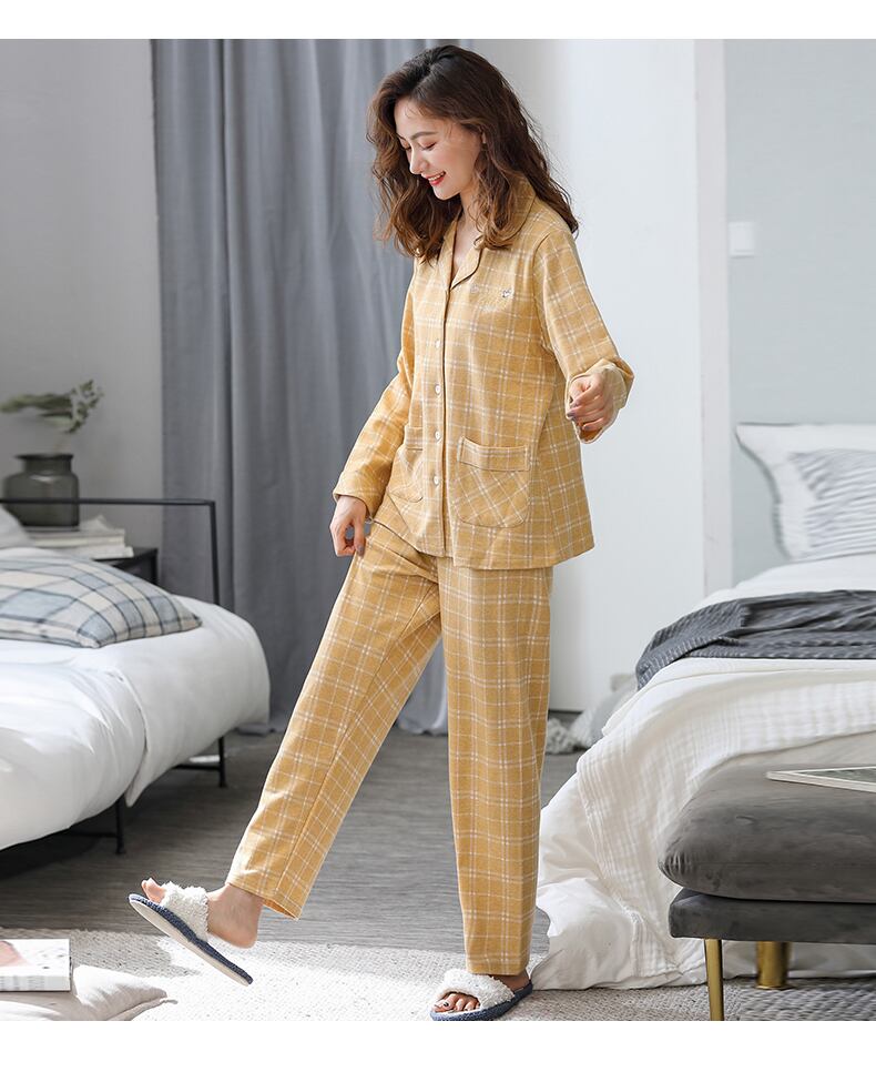 パジャマ ルームウェア ナイトウェア チェック柄 綿 コットン 通気性 吸水性 フロントボタン 前開き パイピング加工 刺繍 ウエストゴム スーツ襟 シンプル 両ポケット サイズ豊富 リラックス 春 秋 女性 レディース