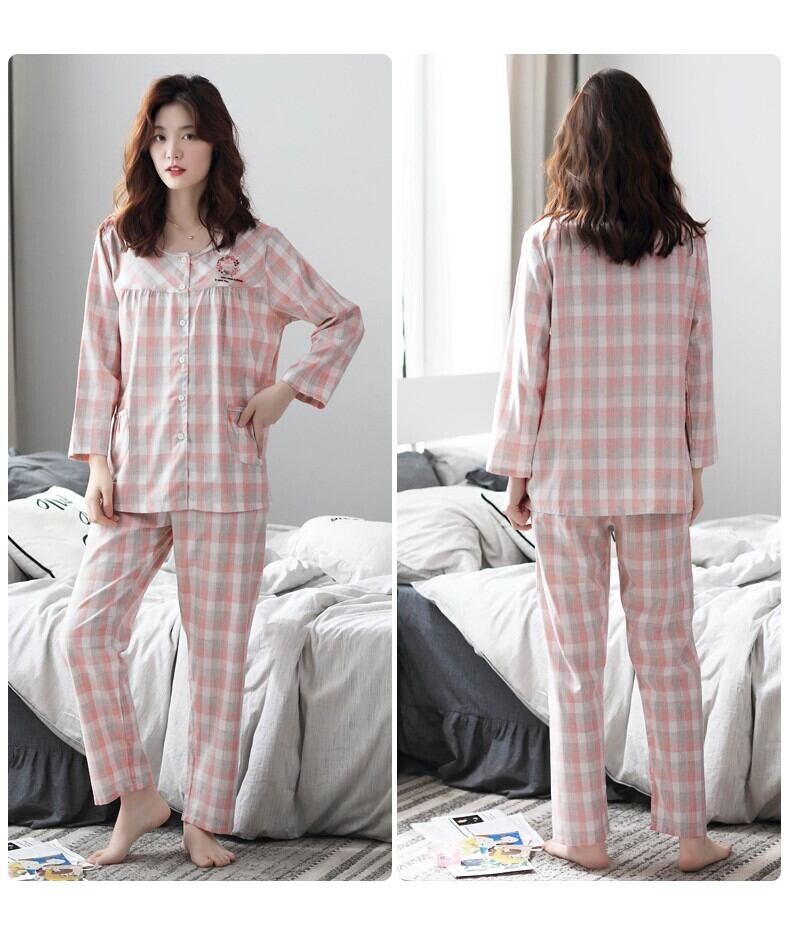 パジャマルームウェアナイトウェア女性レディースコットン綿チェック柄ラウンドネックフロントボタン前開き長袖ウエストゴム両ポケット刺繍ゆったりサイズ豊富春秋