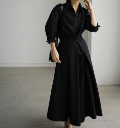 ロングワンピース シャツワンピース 細見え 春夏 普段使い ルーム お出かけ デート 黒 アプリコット 綿 Vネック 襟付き ボタン 大きめ 無地 大人 清楚 可愛い 上品 シンプル ゆったり Aライン 長袖 マキシ丈 人気 トレンド 10代 20代 30代