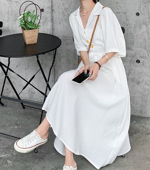 シャツワンピース ロングワンピース 細見え 春夏 普段使い お出かけ デート リゾート 白 ブルー パープル シフォン Vネック 襟付き 大きめ 無地 ボタン ウェストリボン 大人 清楚 可愛い 上品 シンプル ゆったり Aライン 五分袖 マキシ丈 人気 トレンド 10代 20代 30代
