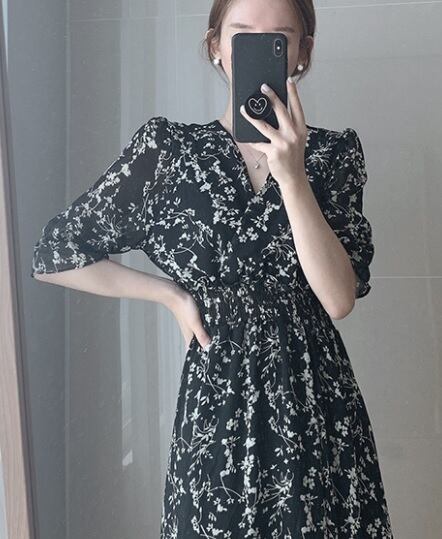 シフォンワンピース 細見え 春夏 普段使い お呼ばれ お出かけ デート 黒 白 花柄 Vネック 大きめ 無地 大人 清楚 可愛い 上品 フェミニン ゆったり Aライン 五分袖 フリル ミモレ丈 人気 トレンド 10代 20代 30代