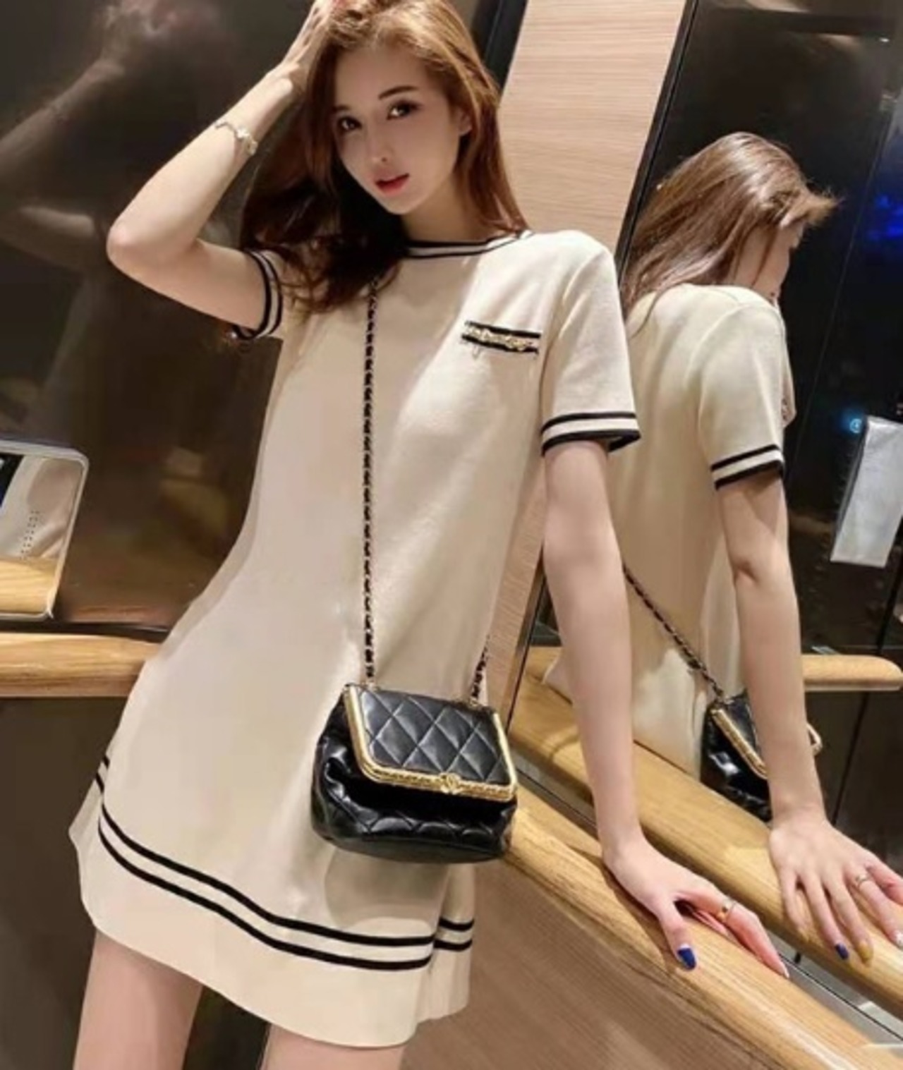 ミニワンピース 細見え 夏 普段使い ルーム お出かけ デート 黒 ベージュ ラウンドネック 大きめ ライン 大人 キュート 可愛い カジュアル レトロ シンプル ゆったり Aライン 半袖 ショート丈 人気 トレンド 10代 20代 30代
