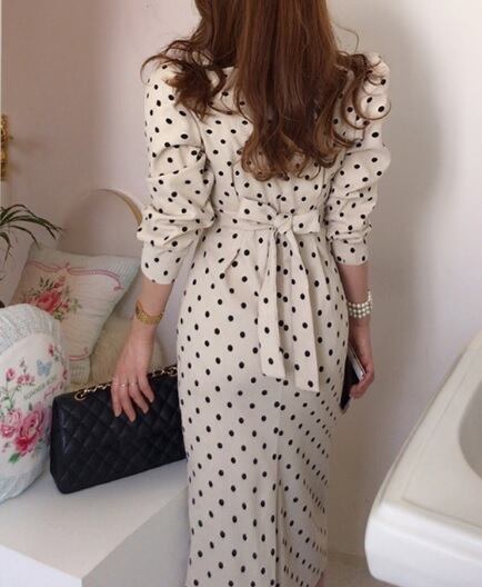 ロングワンピース 細見え 夏 普段使い ルーム お出かけ デート ブラウン アプリコット 綿 Vネック 水玉模様 ドット 大人 清楚 可愛い 上品 キュート レトロ ゆったり 長袖 パフスリーブ ミモレ丈 人気 トレンド 10代 20代 30代