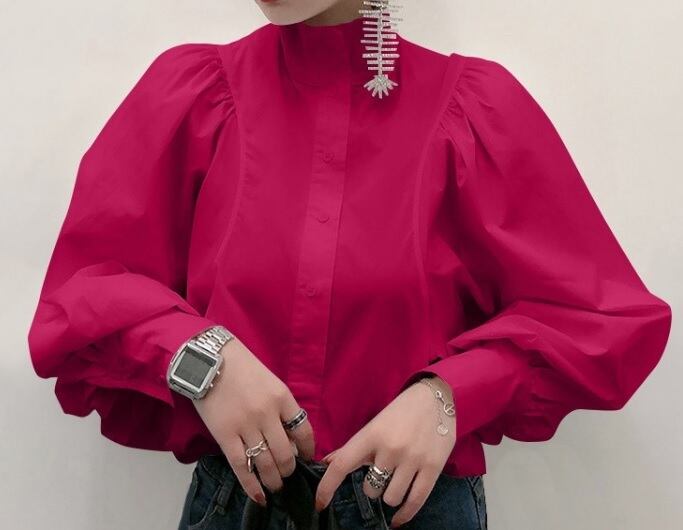 トップス シャツ ブラウス おしゃれ シンプル ゆったり 白 黒 レッド 綿 無地 ハイネック 長袖 バルーン袖 春 秋 大きいサイズ 大人可愛い 10代 20代 30代 お出かけ デート お呼ばれ 通勤 仕事 オフィス OL 上品 トレンド 人気
