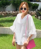 トップス ブラウス おしゃれ シンプル ゆったり 白 黒 綿 無地 Vネック 五分袖 フリル 春 夏 キュート レトロ 大人可愛い 10代 20代 30代 お出かけ デート カジュアル 体型カバー トレンド 人気