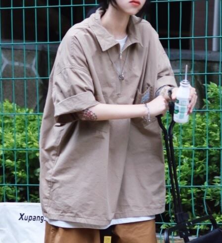 トップス シャツ おしゃれ シンプル ゆったり ブラウン グレー ネイビー 黒 バイカラー 襟付き 五分袖 夏 大きいサイズ 大人可愛い 10代 20代 30代 お出かけ デート カジュアル ラフ クール かっこいい トレンド 人気