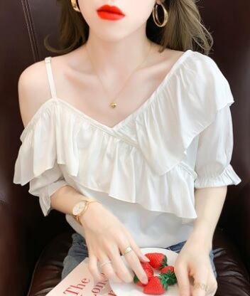 トップス ブラウス ワンショルダー 肩だし おしゃれ シンプル ゆったり 白 ブルー シフォン フリル 無地 半袖 夏 大きいサイズ 大人可愛い セクシー 10代 20代 30代 お出かけ デート お呼ばれ リゾート キュート 個性的 トレンド 人気