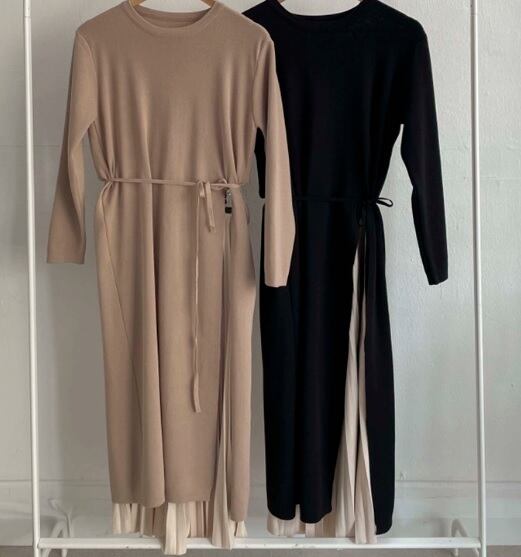 ロングワンピース プリーツ 細見え 秋 普段使い 個性的 お出かけ デート 黒 ベージュ ラウンドネック スリット 無地 大人 清楚 可愛い 上品 キュート ゆったり Aライン 長袖 ミモレ丈 人気 トレンド 10代 20代 30代