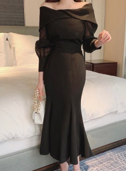 マーメイドワンピース 細見え 春 秋 お呼ばれ パーティー ディナー 二次会 お出かけ デート 黒 白 アプリコット オフショルダー 透け感 無地 大人 清楚 可愛い 上品 セクシー シンプル ゆったり Aライン 長袖 ミモレ丈 人気 トレンド 韓国 10代 20代 30代