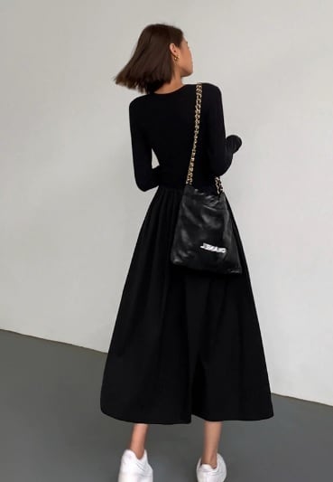 ロングワンピース 細見え 秋 普段使い お出かけ デート 黒 グレー ラウンドネック 無地 大人 個性的 可愛い シンプル ゆったり Aライン 長袖 ミモレ丈 人気 トレンド 10代 20代 30代