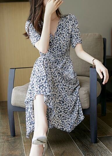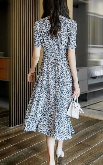 ワンピース 細見え 春 夏 普段使い お呼ばれ お出かけ デート ブルー Vネック 大きめ 花柄 大人 清楚 可愛い 上品 レトロ キュート ゆったり Aライン 半袖 ひざ丈 人気 トレンド 10代 20代 30代