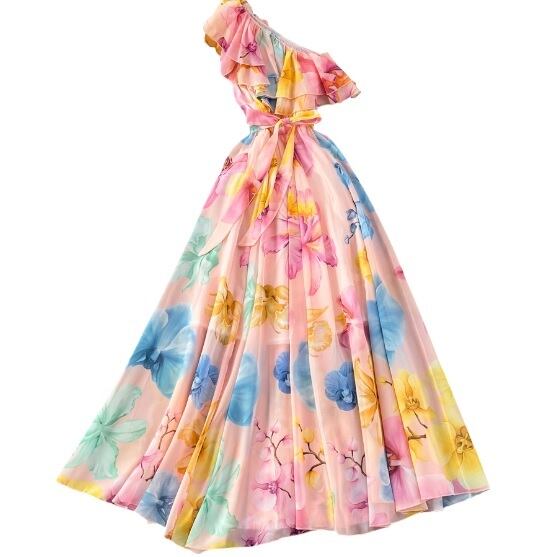 プリーツワンピース 細見え 夏 普段使い お呼ばれ お出かけ デート リゾート ピンク ブルー ワンショルダー リボン フリル 大きめ 花柄 大人 清楚 可愛い 上品 個性的 ゆったり Aライン ノースリーブ ミモレ丈 人気 トレンド 10代 20代 30代