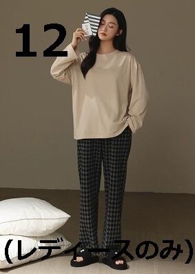 ルームウェア パジャマ 寝間着 オシャレ 楽 リラックス 長袖 ラウンドネック 綿 黒 白 グリーン ベージュ チェック柄 キャラクター ロゴ ボーダー 部屋着 セットアップ 上下セット 春 秋 大きめ シンプル ペアルック お揃い カップル レディース メンズ ユニセックス 人気