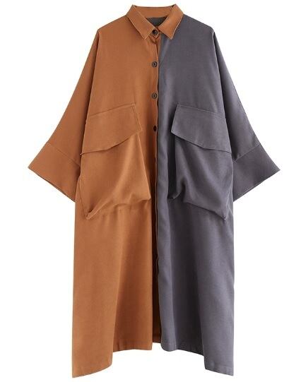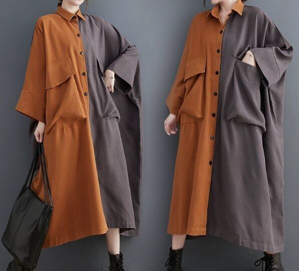 アウター ステンカラーコート 防寒 ロング丈 ブラウン グレー バイカラー 春 秋 長袖 10代 20代 30代 お出かけ デート 通勤 OL 仕事 個性的 トレンド 大人女子 可愛い クール かっこいい カジュアル 暖かい 人気