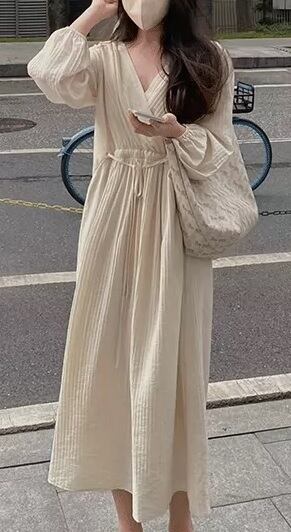 ロングワンピース 細見え 春夏 普段使い ルーム お出かけ デート ブルー ベージュ 綿 Vネック 無地 大人 カジュアル 清楚 可愛い 上品 シンプル ゆったり Aライン 長袖 バルーン袖 ミモレ丈 人気 トレンド 10代 20代 30代
