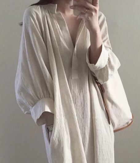 ロングワンピース 細見え 春 秋 普段使い ルーム お出かけ デート アプリコット Vネック 大きめ 無地 大人 カジュアル 清楚 可愛い 上品 シンプル ゆったり Hライン 長袖 バルーン袖 ミモレ丈 スリット 人気 トレンド 10代 20代 30代