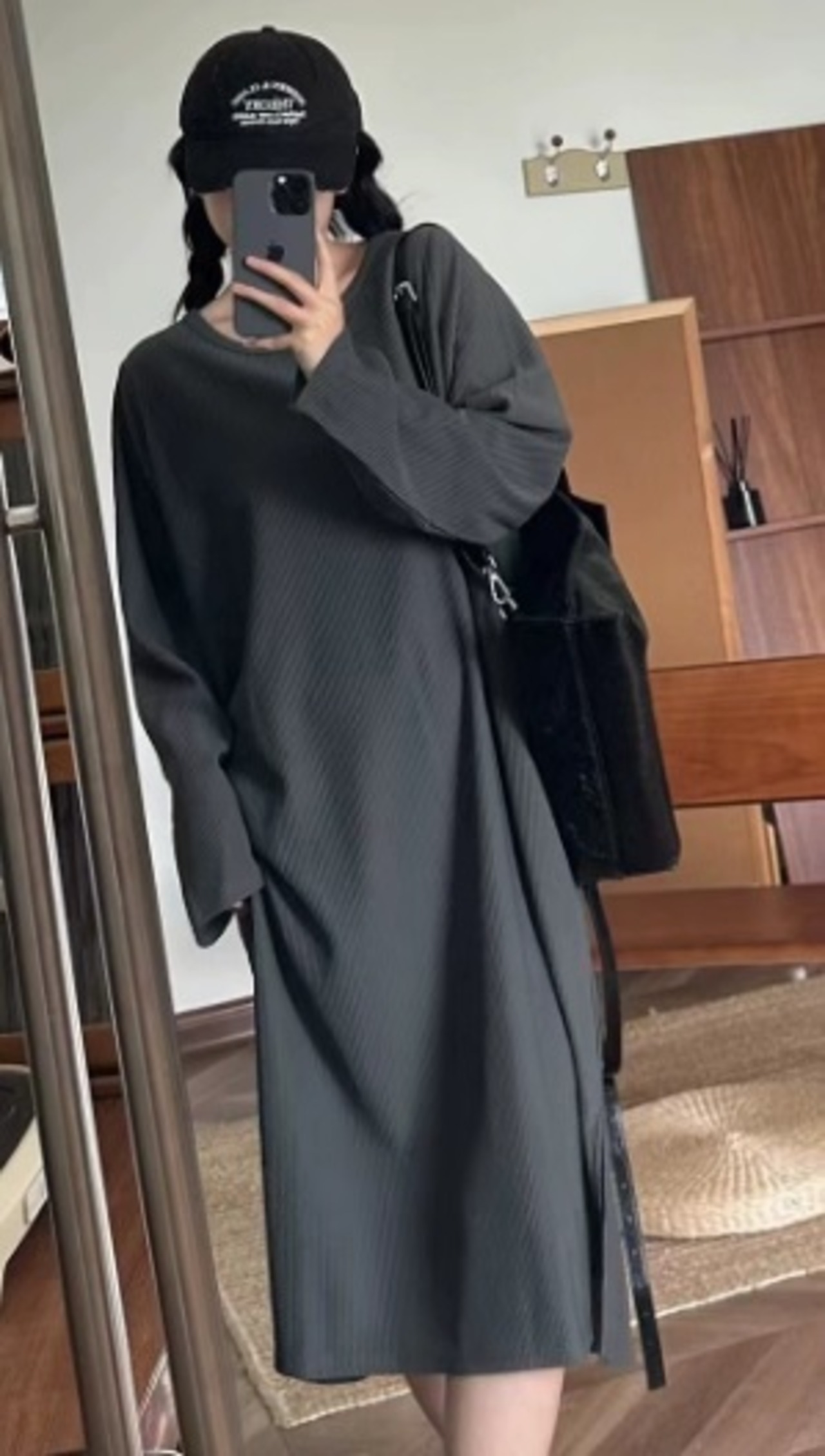 ワンピース 細見え 春 秋 普段使い ルーム お出かけ デート 黒 グレー ラウンドネック スリット 無地 大人 カジュアル 清楚 可愛い シンプル ゆったり Hライン 長袖 ミモレ丈 人気 トレンド 10代 20代 30代